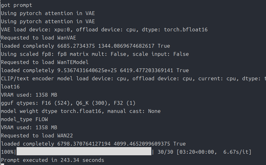 一応参考までに、「640×640」を「97フレーム」、「クリップの読み込み」を「CPU」に、「Q6_K」、「–lowvram」オプションで「ステップ数」は「30」です。生成時間は243秒でした。