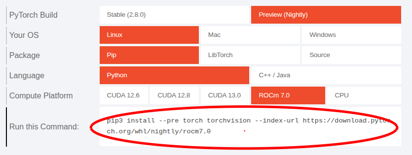 「pip install –pre torch torchvision –index-url https://download.pytorch.org/whl/nightly/rocm7.0」の部分は、