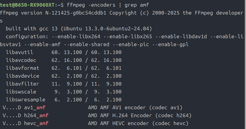 一度再起動したのち、「ffmpeg -encoders | grep amf」を実行すると、