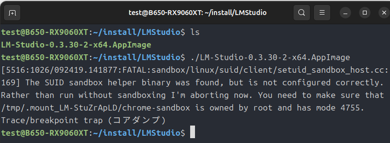 ./LM-Studio-0.3.30-2-x64.AppImageで実行権限を与えて「./LM-Studio-0.3.30-2-x64.AppImage」で動かそうとしたのですが、ここで問題発生。