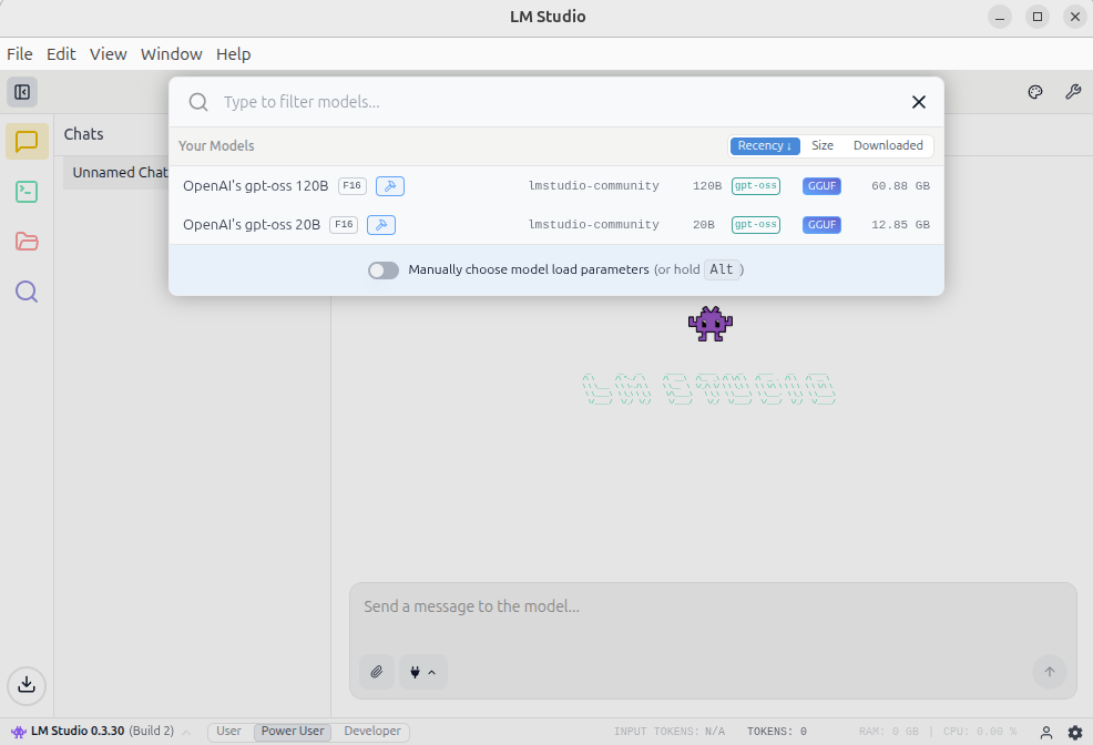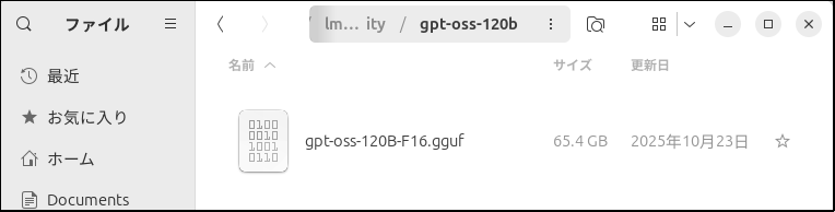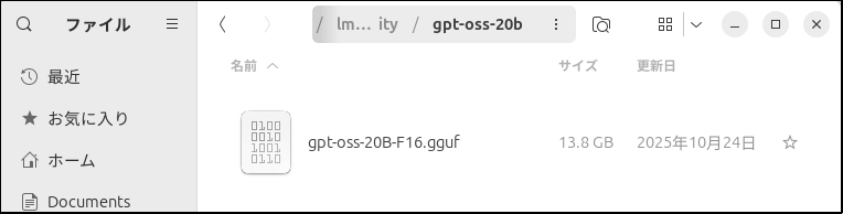 gpt-oss-20bは動かすには手頃なのでダウンロードしてみるのも良いと思いますが、以前の記事でllama.cpp用にダウンロードしてggufに変換したファイルがあるのでそちらを再利用します。