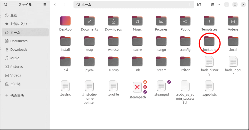 注意点ですが、「.lmstudio」は隠しファイルになっていますので、