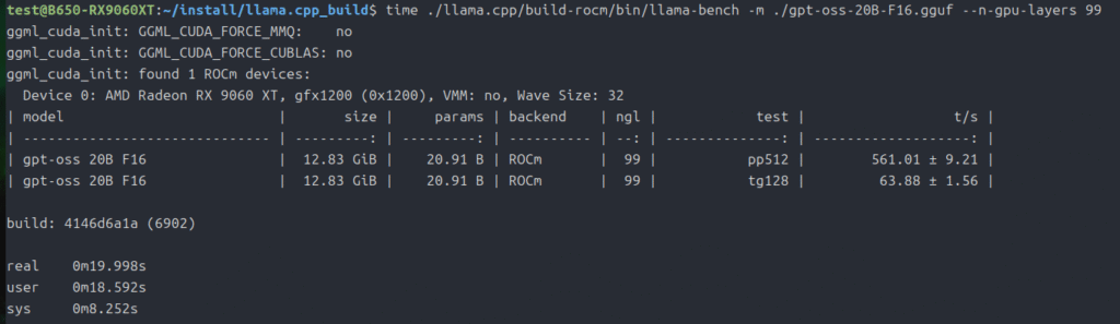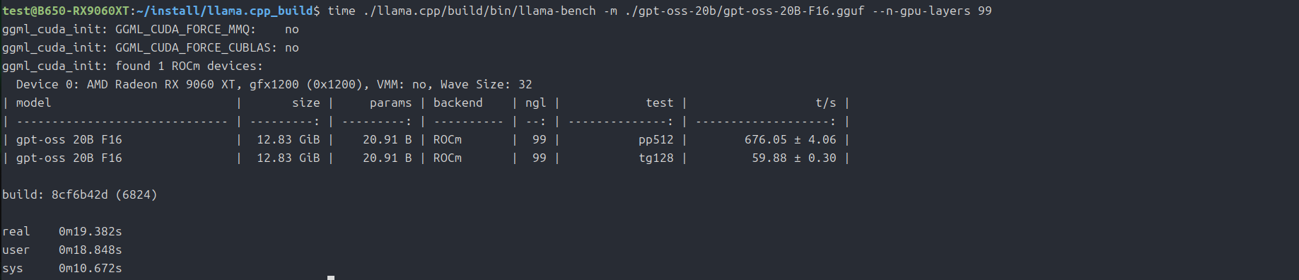 time ./llama.cpp/build-rocm/bin/llama-bench -m ./gpt-oss-20B-F16.gguf --n-gpu-layers 99