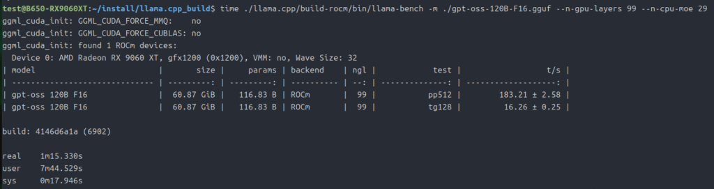 time ./llama.cpp/build-rocm/bin/llama-bench -m ./gpt-oss-120B-F16.gguf --n-gpu-layers 99 --n-cpu-moe 29