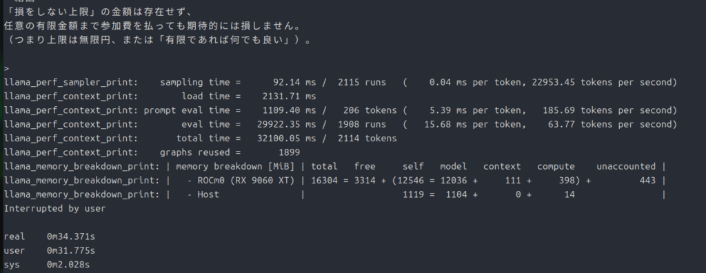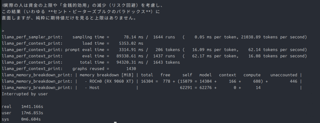 time ./llama.cpp/build-rocm/bin/llama-cli -m ./gpt-oss-20B-F16.gguf --n-gpu-layers 99 -p "偏りのないコインを表が出るまで投げ続け、表が出たときに、賞金をもらえるゲームがあるとする。もらえる賞金は、1回目に表が出たら1円、1回目は裏が出て2回目に表が出たら倍の2円、2回目まで裏が出ていて3回目に初めて表が出たらそのまた倍の4円、3回目まで 裏が出ていて4回目に初めて表が出たらそのまた倍の8円、というふうに倍々で増える賞金がもらえるというゲームである。ここで、このゲームには参加費(=賭け金)が必要であるとしたら、参加費の金額が何円までなら払っても損ではないと言えるだろうか。"