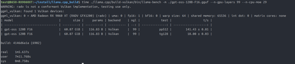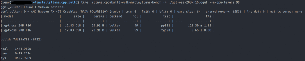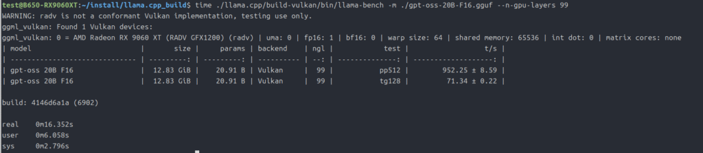 time ./llama.cpp/build-vulkan/bin/llama-bench -m ./gpt-oss-20B-F16.gguf --n-gpu-layers 99上記はllama.cpp(vulkan動作)のコマンドです。