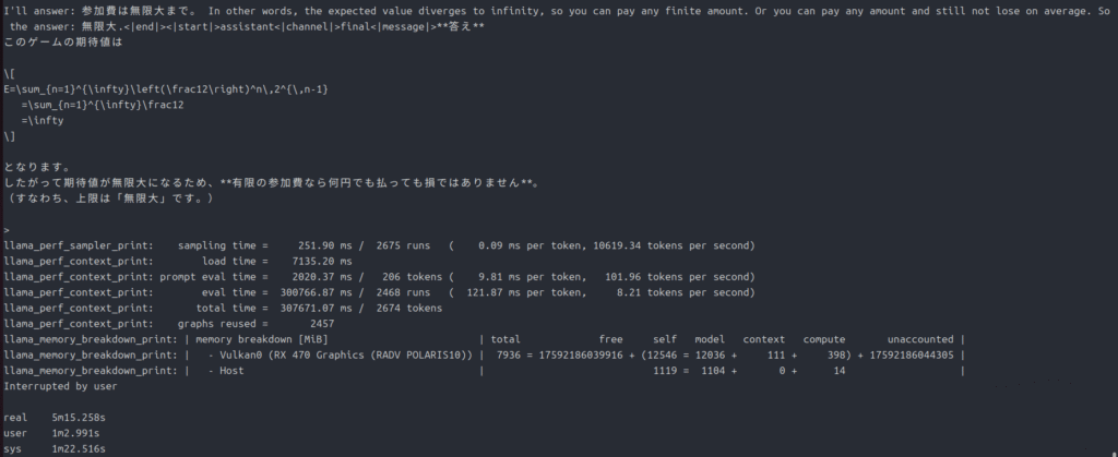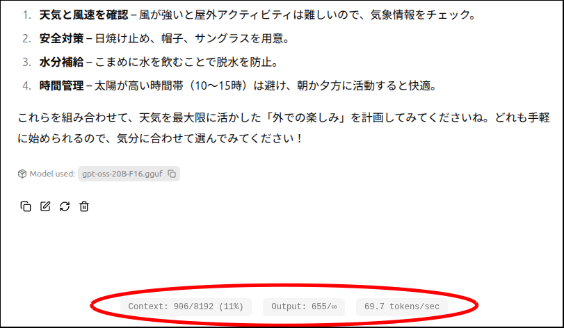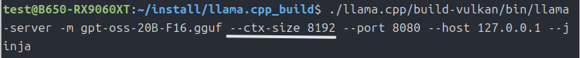 ./llama.cpp/build-vulkan/bin/llama-server -m gpt-oss-20B-F16.gguf --ctx-size 8192 --port 8080 --host 127.0.0.1 --jinja4096のコンテキスト長だとすぐに終わってしまうので、上記コマンドで調整できます(まぁ限度はありますが)。