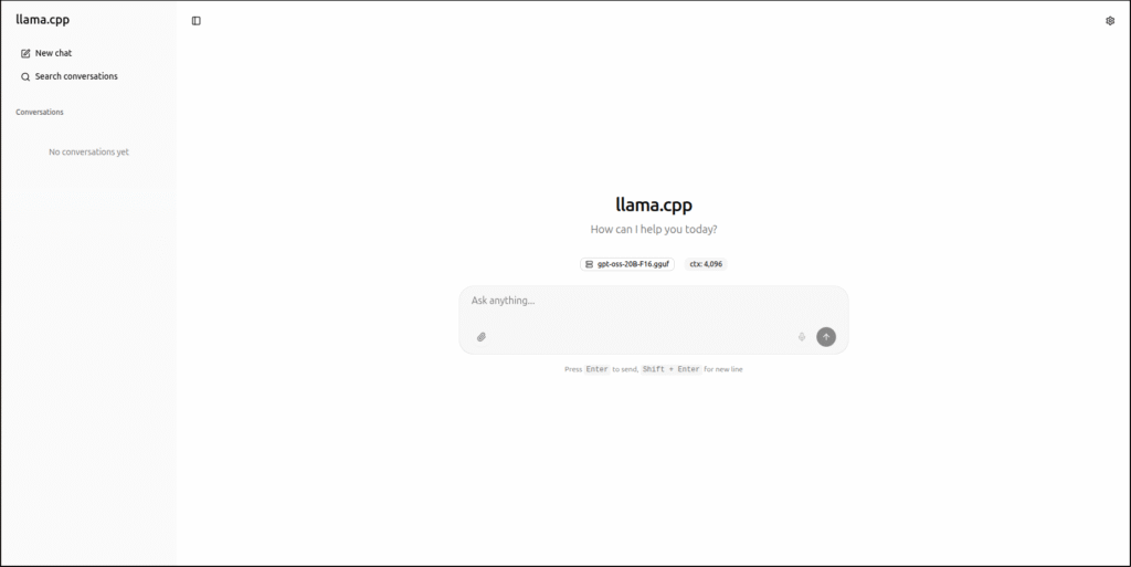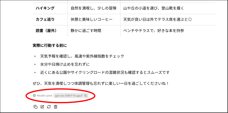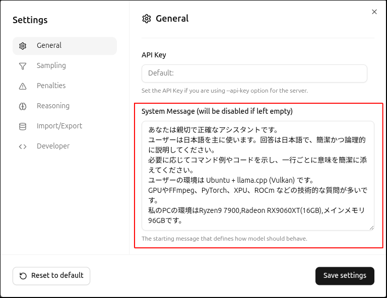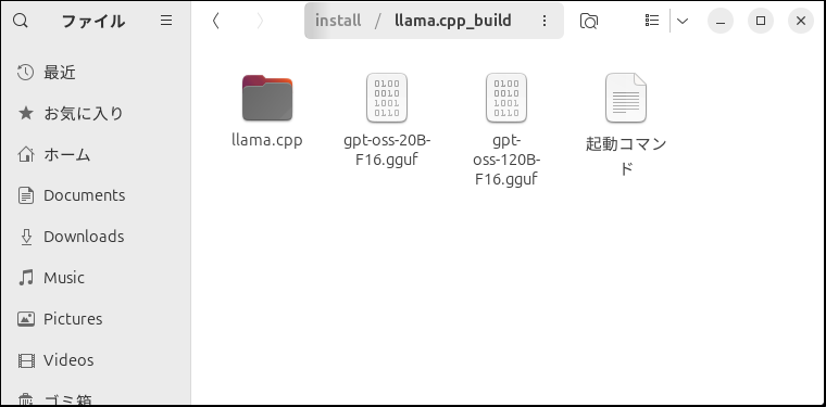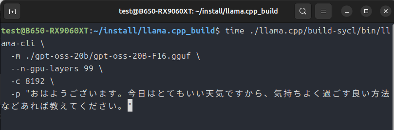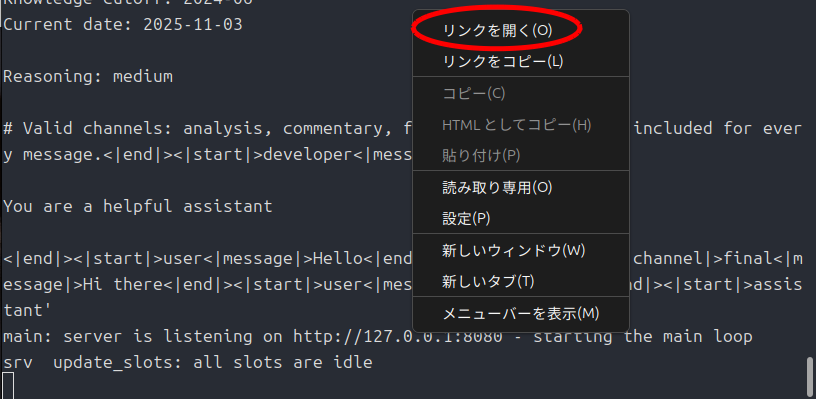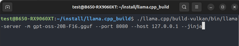 ./llama.cpp/build-vulkan/bin/llama-server -m gpt-oss-20B-F16.gguf --port 8080 --host 127.0.0.1 --jinja上記コマンドで起動します。
