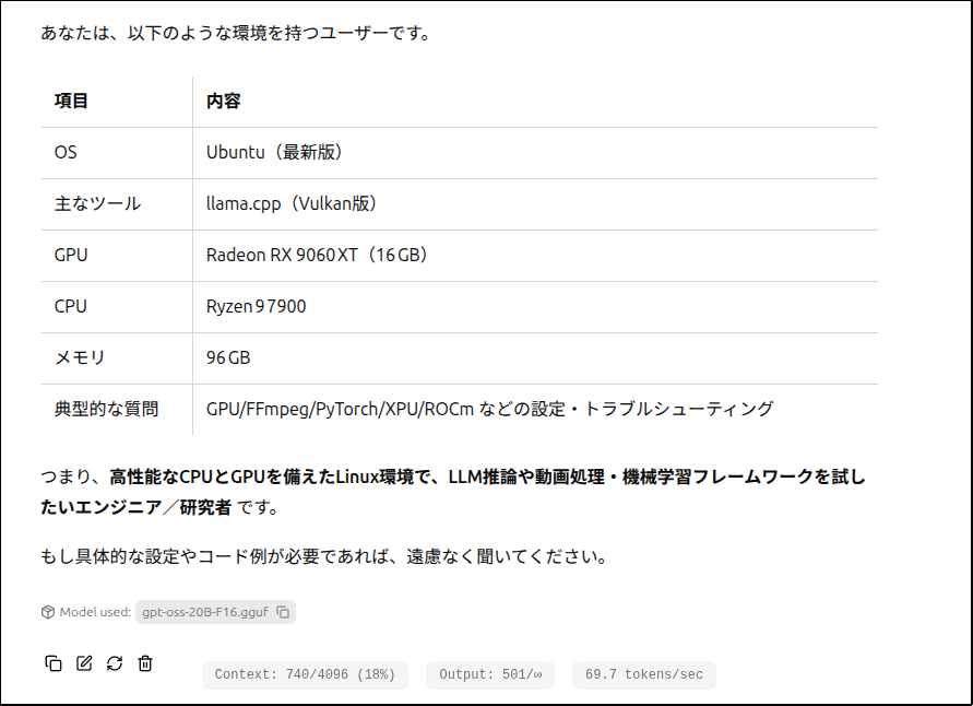 「gpt-oss-20b」くらいなら、Radeon RX9060XT(16GB)でとても快適にチャットできますね。