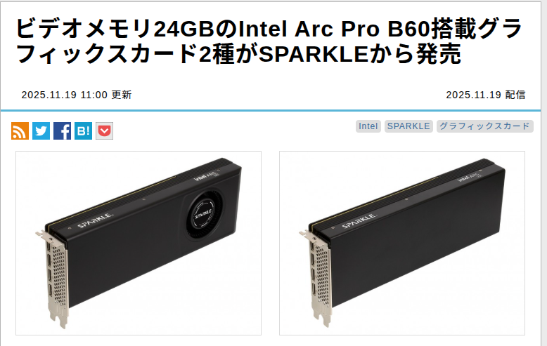 ということは、「Intel ARC PRO B60(24GB)」は、コスパの観点から「7900XTX」より価格は下がらないと競争力はなくなります(ARC PROの付加価値しだいですが)。