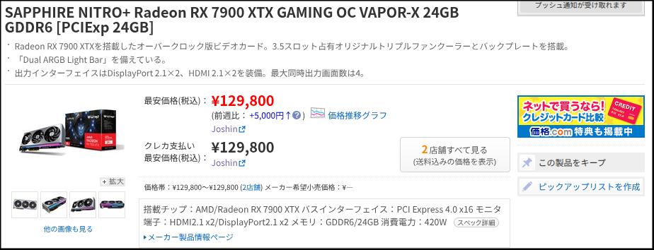 ただ、2025/11/20時点で、同じVRAM容量の「Radeon RX 7900XTX」が約13万。