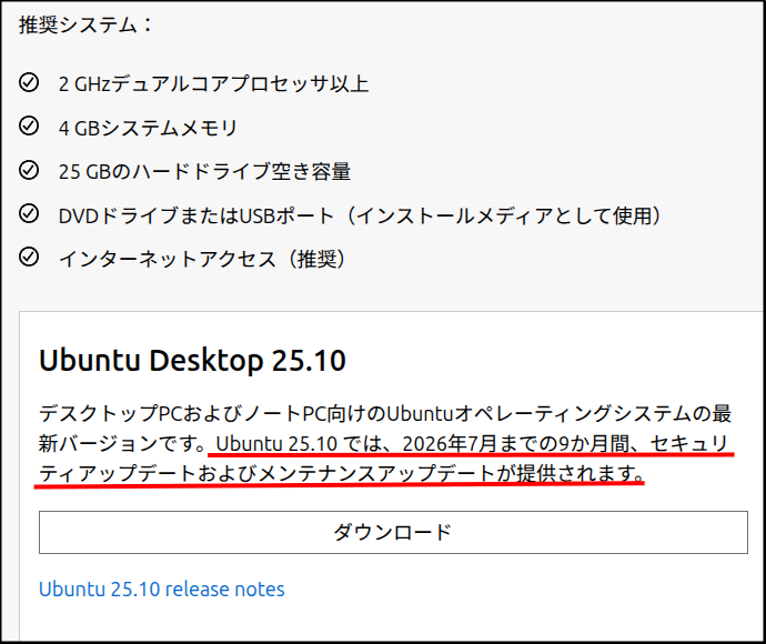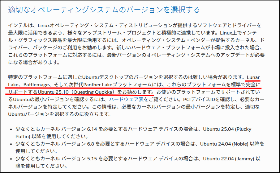 2025/11/22の時点では、Arc Pro B60を使う場合、Ubuntu25.10が推奨されていますのでこの記事ではこれを使いますが、2026/4〜5以降に26.04LTS(になると思われます)が登場したらその時は26.04LTSを使えば良いと思います。