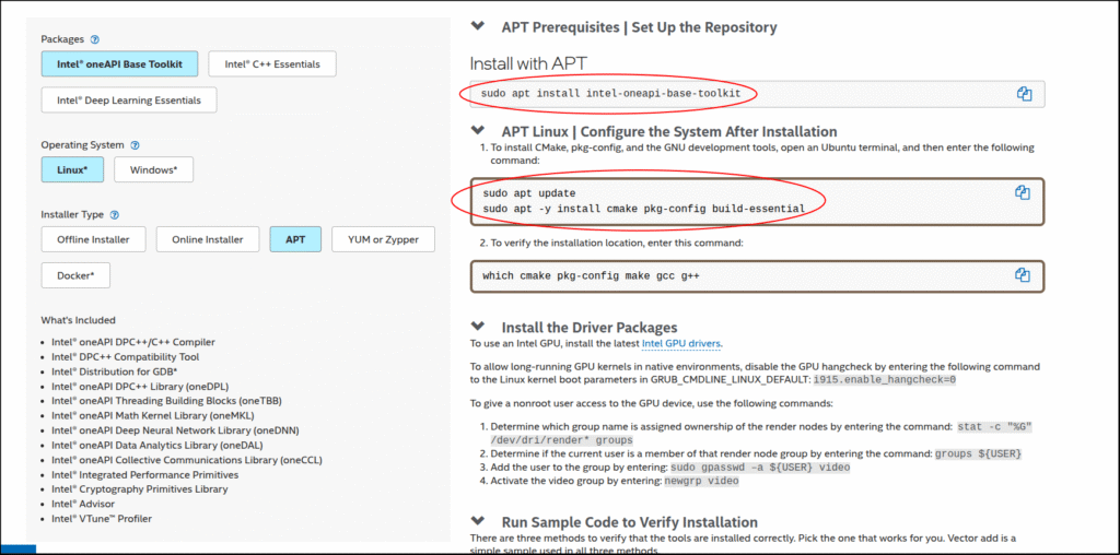 25.10ではなく、Ubuntu24.04.3を使うことになったわけですが、そのためかわかりませんが上のスクリプトでは「intel-oneapi-base-toolkitが見つかりません。」となります。