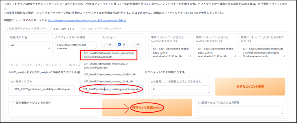 「GPT-SoVITS-For-Intel」ではモデルファイルは「v4」を使ってね、みたいに書かれてあったのですが、今回は本家の「v2」を使っています。