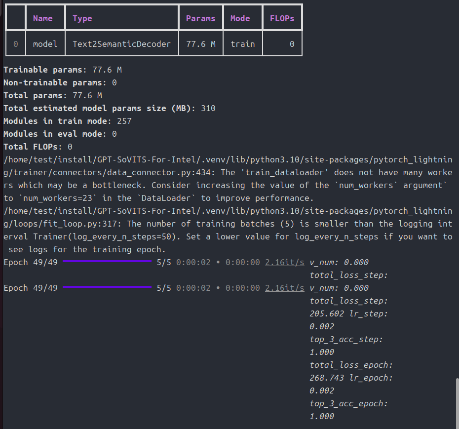 「数ショットTTS」では「GPTトレーニング」と「SoVITSトレーニング」のふたつを行いますが、「GPT-SoVITS-For-Intel」をそのまま使っても動作自体はします。ただし「SoVITSトレーニング」の方の処理がCPUにフォールバックされて遅くなってしまいます。