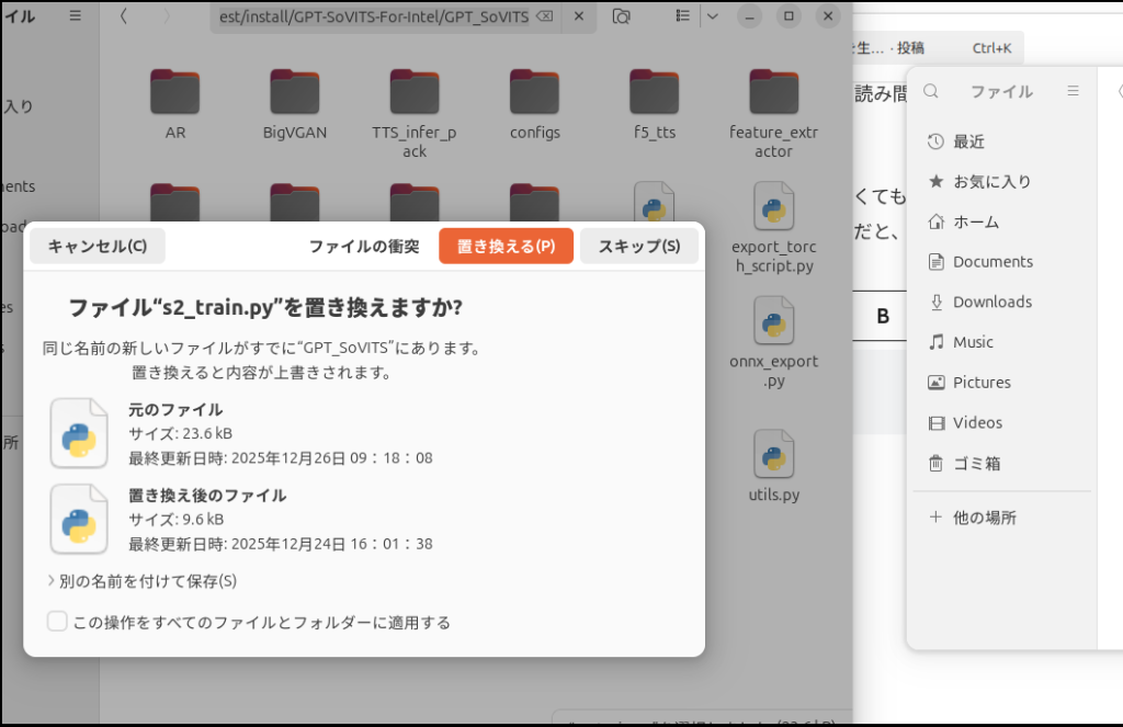 「GPT-SoVITS-For-Intel/GPT_SoVITS」の中にある「s2_train.py」と先程作ったファイルと差し替えます。