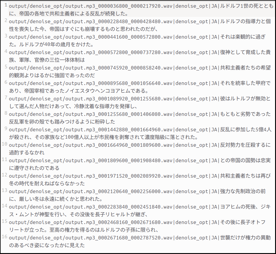 読み上げに90秒ほどかかっていますが、後の「ノイズ除去(これはやらなくてもいいのですが)」処理でいくらか短くなる可能性がありますので、60秒ちょうどのファイルだと、学習に足りなくなるかもしれません。