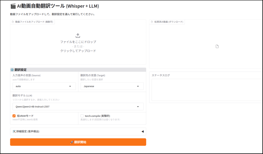 重たいモデルファイルを選べば翻訳の質は向上しますが、終了までの時間が飛躍的に伸びます。