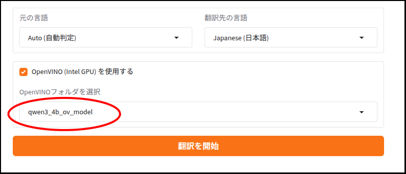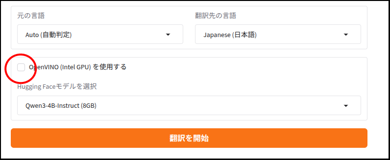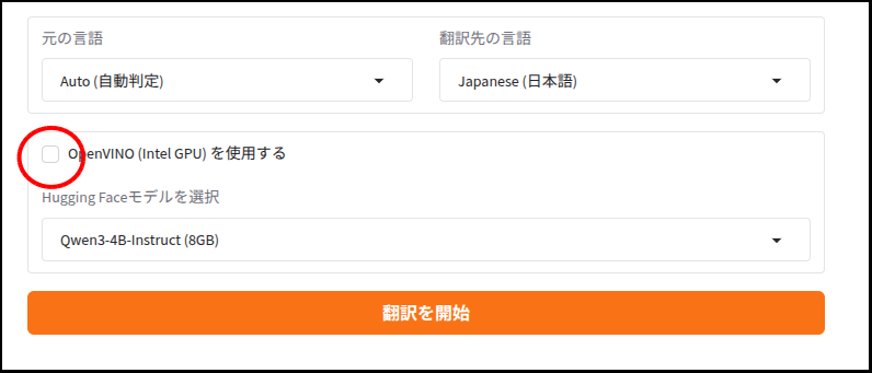 use_ov = gr.Checkbox(label="OpenVINO (Intel GPU) を使用する", value=True)