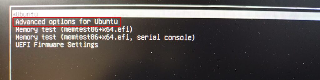 - 「Advanced options for Ubuntu」(Ubuntuの高度なオプション)を選択します。
