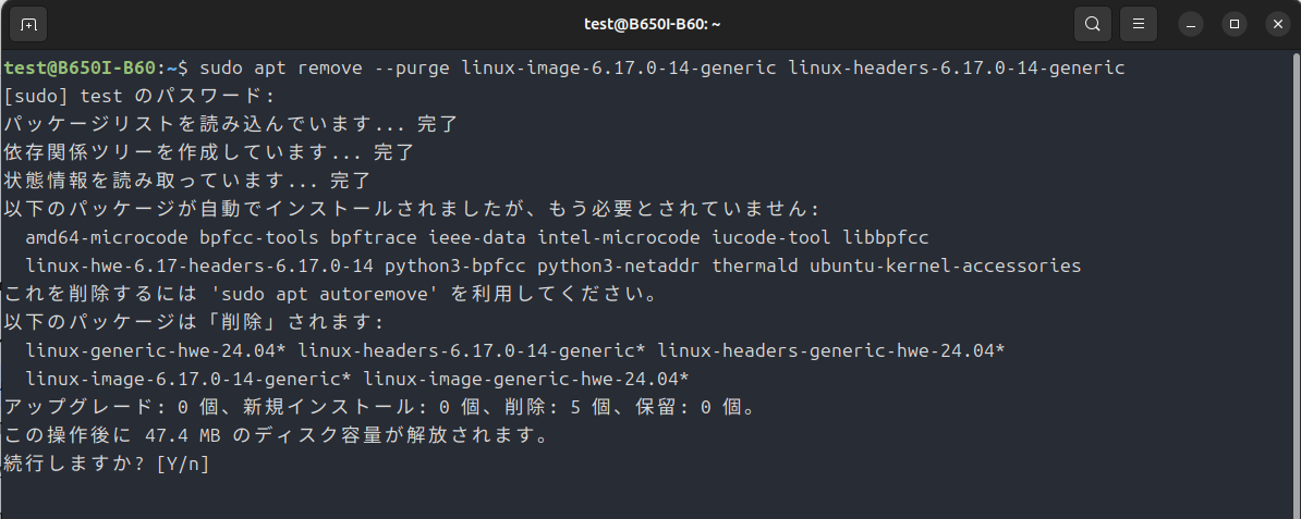 「sudo apt remove –purge」を実行した後、「rmdir: ‘/lib/modules/6.17.0-14-generic’ を削除できません: ディレクトリは空ではありません」と出ているので、以下のコマンドで掃除しておきます。