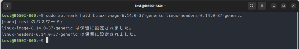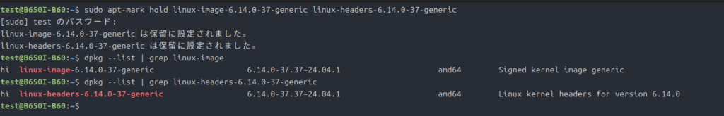 sudo apt-mark unhold linux-image-6.14.0-37-generic linux-headers-6.14.0-37-genericそれでは、ちゃんと固定されているか確認しましょう。