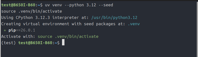 「(test) test@B650I-B60:~$」のように、頭に(test)とついているとuv環境は実行されています。