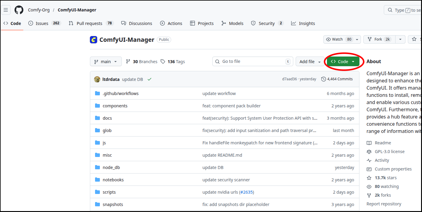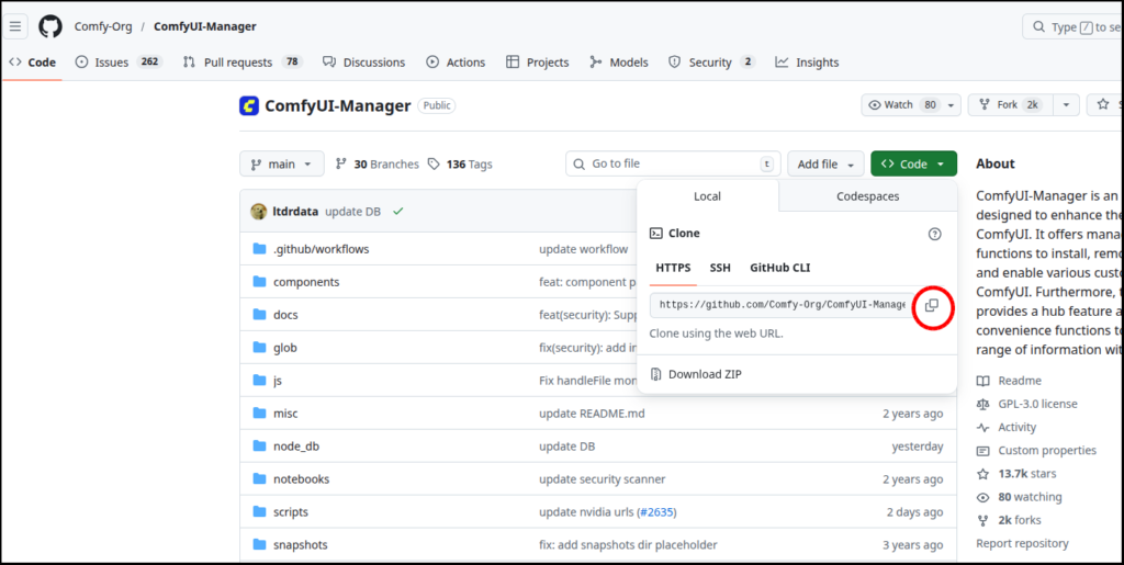 例として「ComfyUI-Manager」を取り上げますが、他のカスタムノードも基本同じ手順でインストールできます。