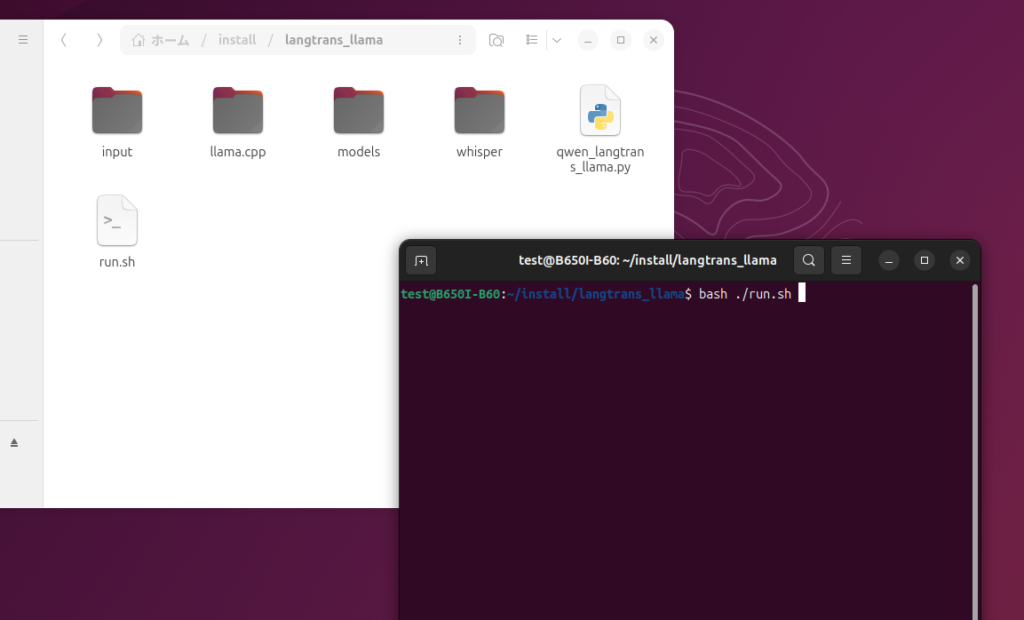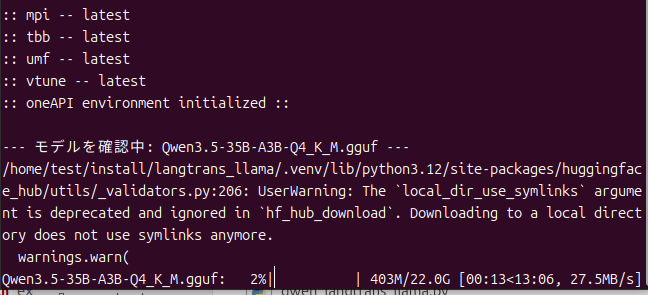 python qwen_langtrans_llama.py上記は以前の記事にはなかったものですが、個人的に「source /opt/intel/oneapi/setvars.sh」の付け忘れが多かったため、最近はこんな感じで起動スクリプトを作っています。