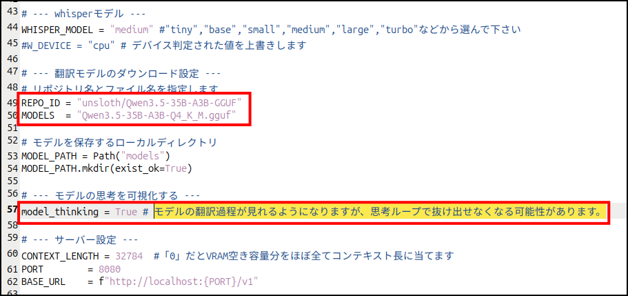 ダウンロードするモデルを選ぶには、「qwen_langtrans_llama.py」の中身を書き換える必要があります。