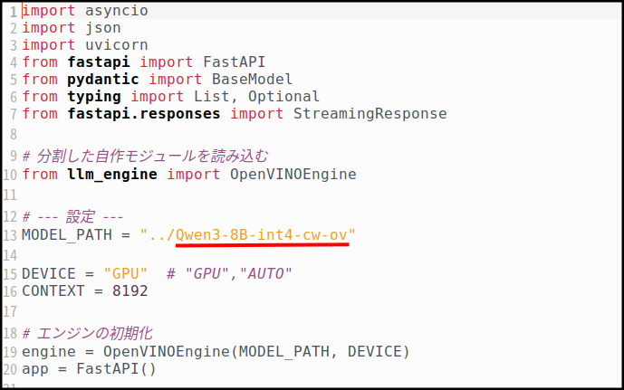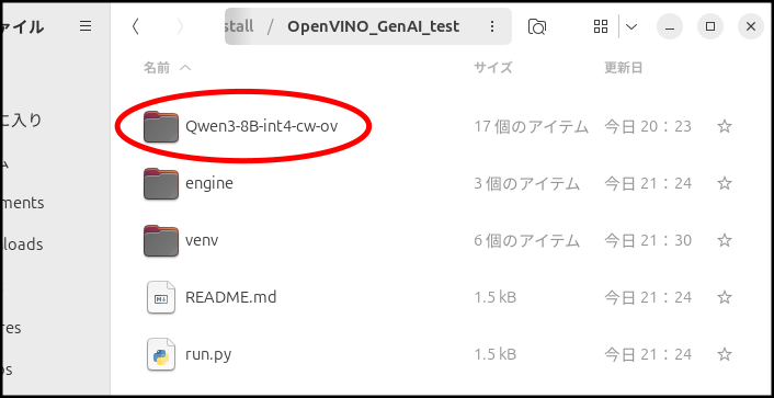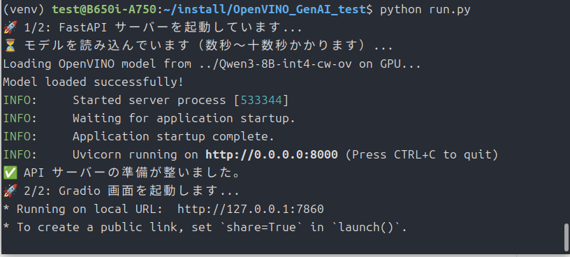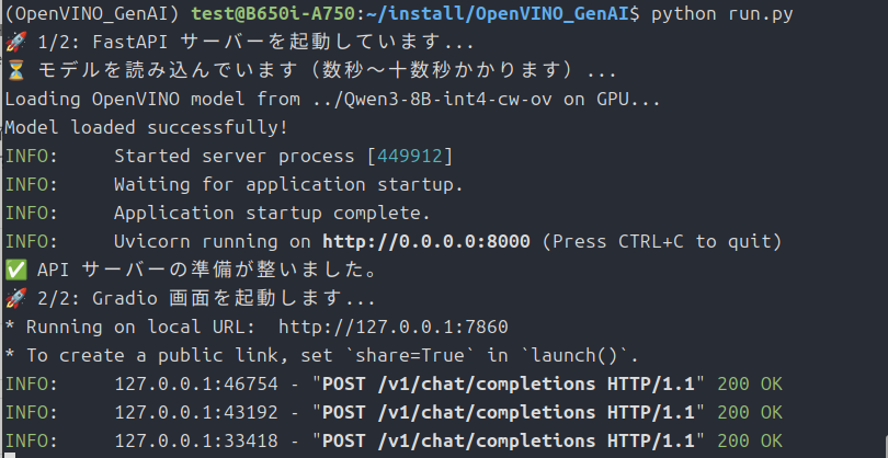 optimum-cli export openvino --model "$MODEL" --weight-format "$QUANTUM" ./models/"$DIR_NAME"-"$QUANTUM"こんな感じで変換できます(結構時間がかかる)。