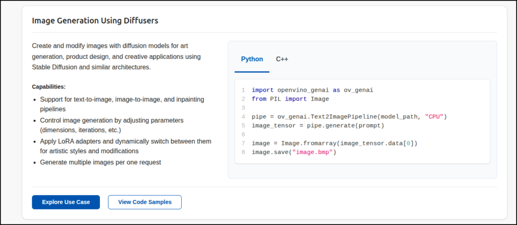 もうちょっと快適にならないものか?そもそもモデルを都度コンパイルする必要があるのか?疑問に思いましたのでOpenVINO GenAIについて調べてみると、専用のパイプラインでの画像生成の手順が書いてありました。