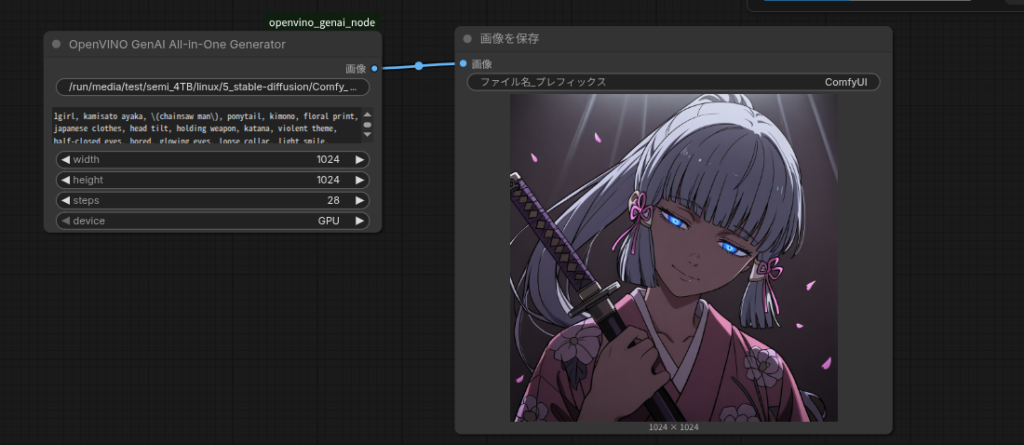 公式のOpenVINO GenAIの画像生成パイプラインは、最初から全部が用意されているため、ノードが一つで済んでしまうとのこと。逆に言えばComfyUI特有の、ノードを組み合わて使うといったことができないのだとか。