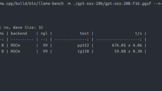 Ubuntu gpt-oss:20b(120b)をRX9060XT(16GB)で動かす(Ubuntu編)(あなたのPCに、より高速なチャッピーを) Amazonのアソシエイトとして、当ブログは適格販売により収入を得ています。以前、Intel ARC B570でチャットAIのllama.cppを動作させる記事を書きましたが、今回はRadeon RX9060XTで動かします。VRAMが16... 2025.10.31 Ubuntu